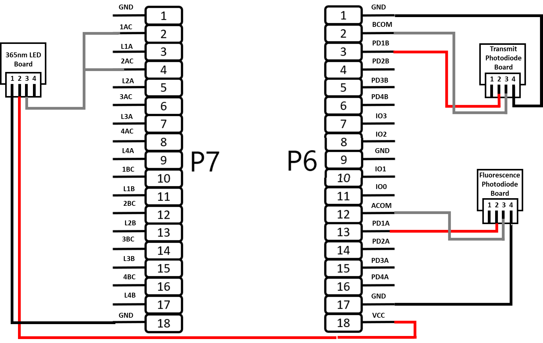 Connect the 365 nm LED Board, Transmit Photodiode Board, and Fluorescence Photodiode Board to the prototyping connectors of the EVAL-ADPD410x-ARDZ, as shown below.