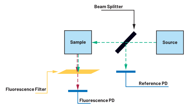 Light is emitted from an LED at 365 nm wavelength. It then passes through a beam-splitter, which directs some of the incident light to a reference photodiode detector for sampling. Quinine in the sample fluoresces due to the 365 nm light and emits ~450 nm light. Another photodiode detector, sensitive to blue light frequencies, is positioned at 90 degrees from the light path to measure the intensity. This placement decreases the effects of the light emitted from the source LED. Additionally, a monochromatic filter is placed in front of the detector to further isolate the measurement.