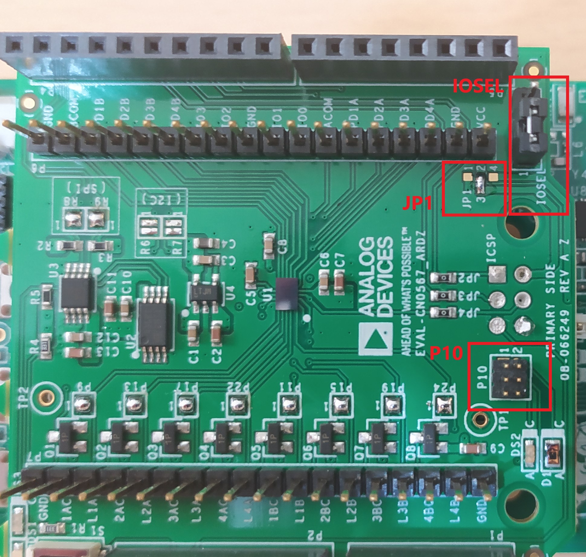 • To connect to the EVAL-ADPD410x-ARDZ, solder the two 18-pin single row female headers at the bottom sides of the prototype board.