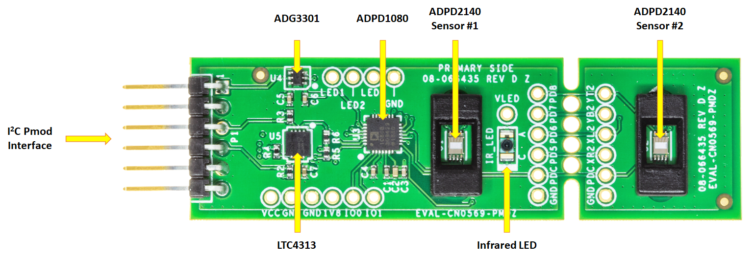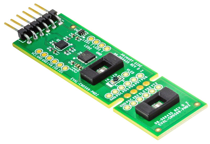 Designed to use the I²C Pmod hardware interface, the EVAL-CN0569-PMDZ features a small form-factor with PCB dimensions of 2.7 in (68.58 mm) × 0.8 in (20.32 mm) x 0.062 in (1.5748 mm). The evaluation board uses the standard 1 x 6, 0.1 in (2.54 mm) right-angle male header for I²C Pmod devices. Two 3D-printed optical baffles are included with the EVAL-CN0569-PMDZ for use with the onboard ADPD2140 sensors.