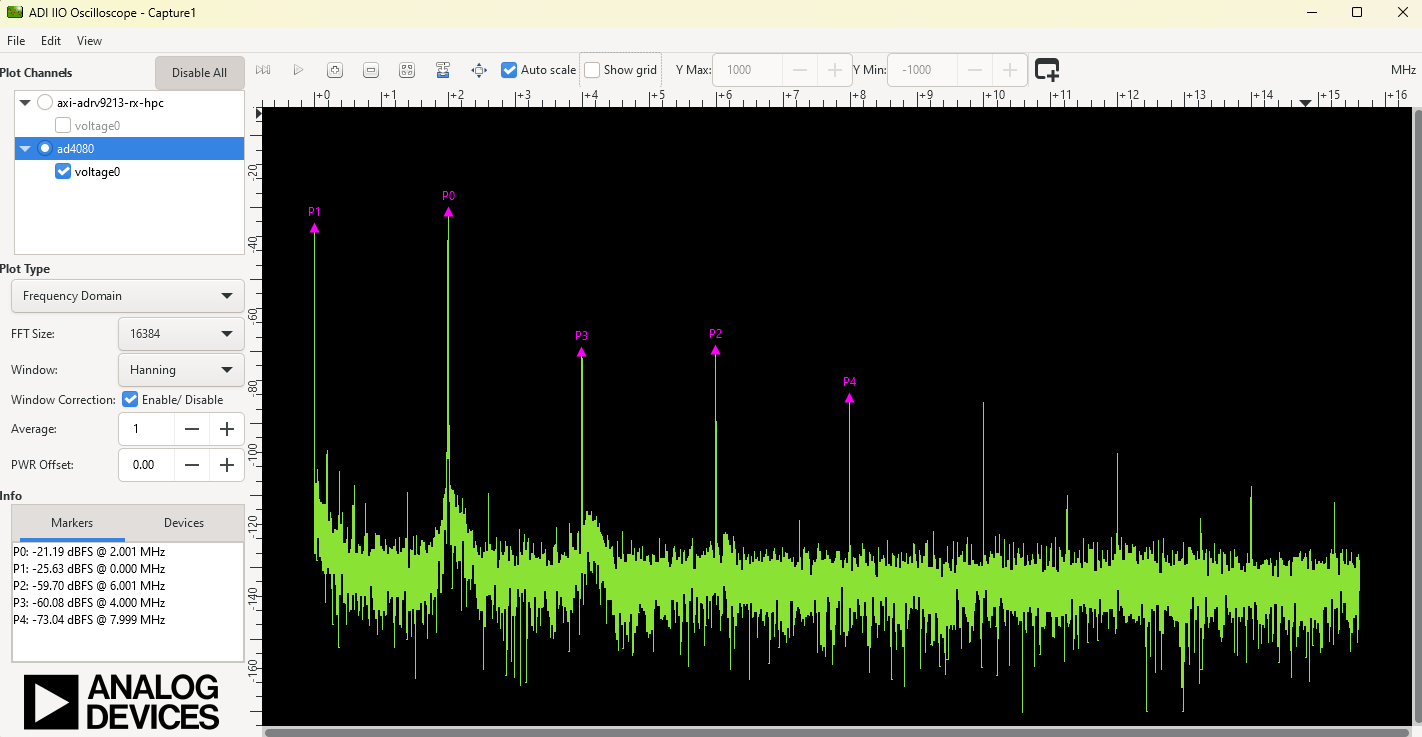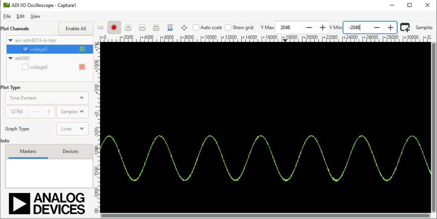 The two data paths are listed in the top-left corner. Check one or both and then click the Capture/Stop button to view the data stream. For the IIO Oscilloscope to work smoothly, it is recommended that the number of samples is set to power of 2, such as 210 (1024) or 216 (65536). The IIO Oscilloscope supports only one scale for each axis so that it is not practical to view the AD9213 high-speed path and the AD4080 precision path simultaneously because the AD9213 (10GSPS) high-speed path is 320 times faster than the AD4080 (31.25MSPS) precision path for the horizontal axis and AD4080 (20-bit) has higher bit resolution than AD9213 (12-bit) for the vertical axis in the ADMX6001-EBZ design.