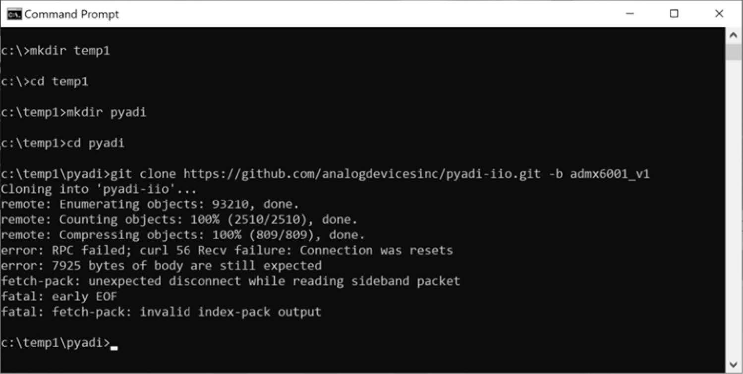 Start a Command Prompt window and clone the PyADI-IIO library for ADMX6001-EBZ.