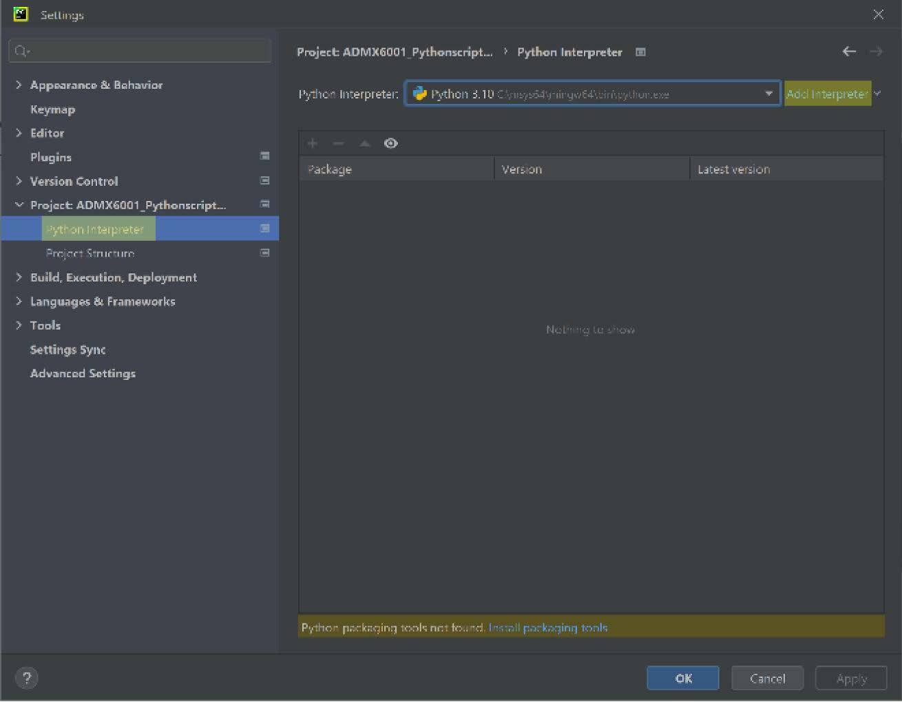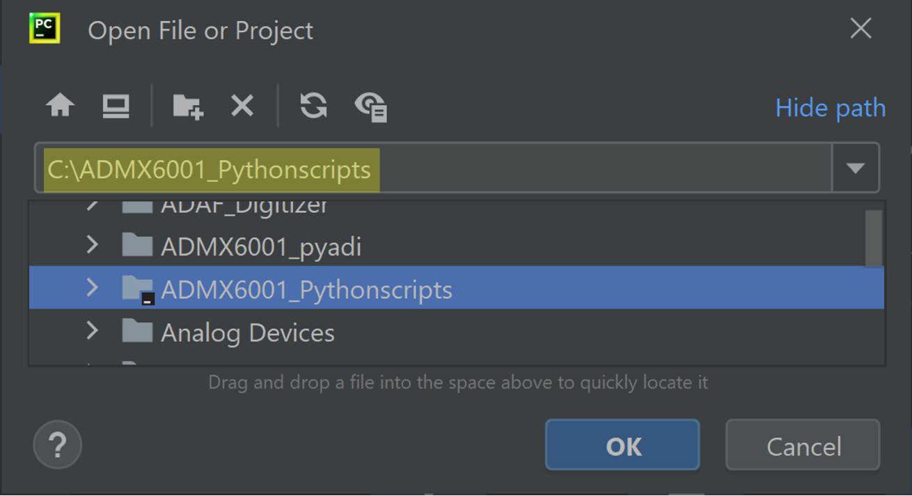 Launch PyCharm and open the ADMX6001_Pythonscripts project