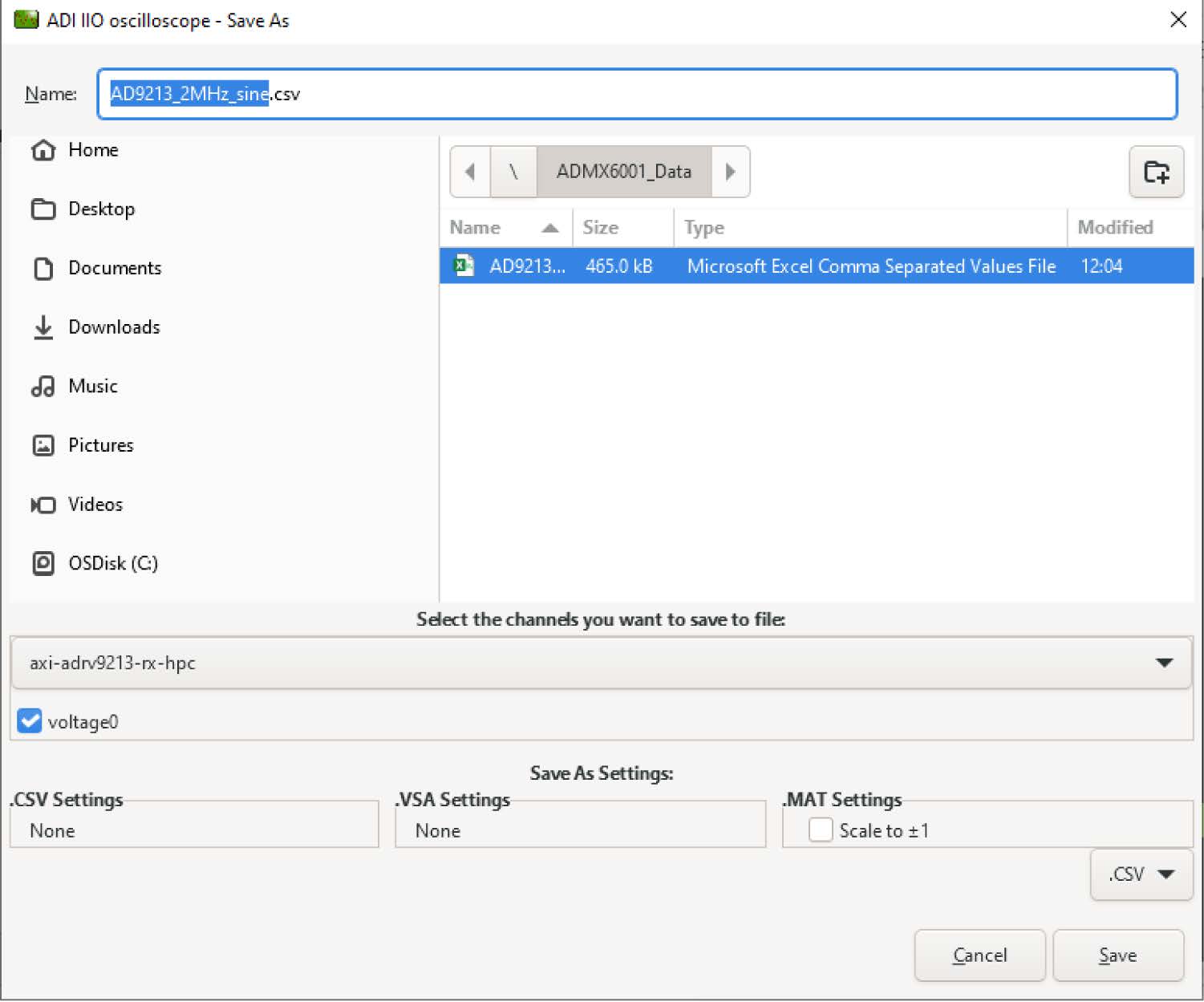 In test mode, the 20-bit AD4080 data is expected to be binary 1010 1100 0101 1101 0110, decimal −342570, or hexadecimal 0xAC5D6. Save the AD4080 data to a .csv file in IIO Oscilloscope and check the value. Refer to the ADMX6001-EBZ Data Acquisition With IIO Oscilloscope section for saving data in IIO Oscilloscope.