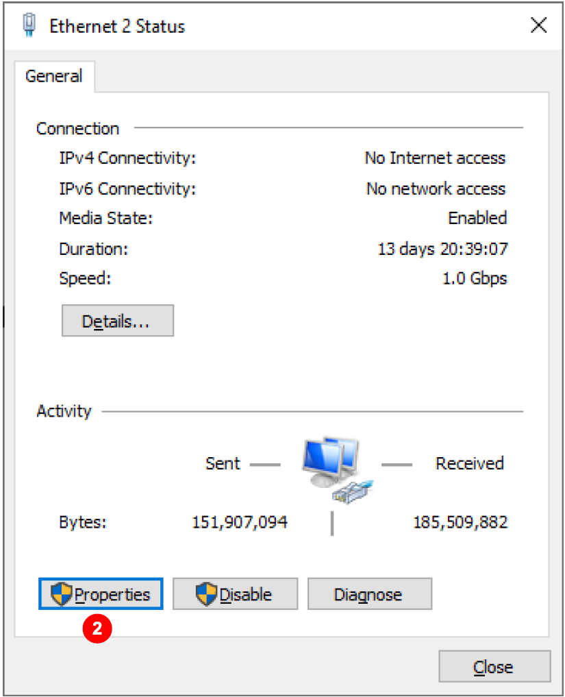 Control Panel -> Network and Sharing Center -> click Ethernet to open the Ethernet Status window, as shown in figure below.