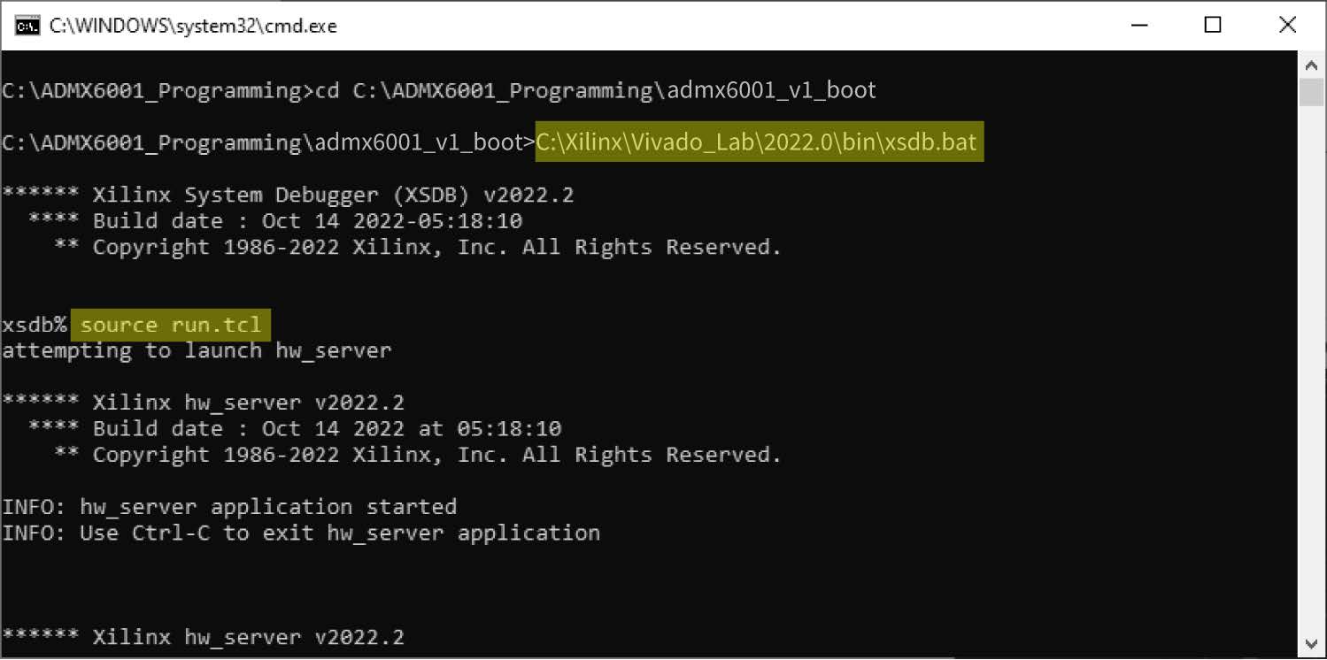 For the Xilinx Vivado Lab version, only xsdb.bat is available (C:XilinxVivado_Lab2024binxsdb.bat).