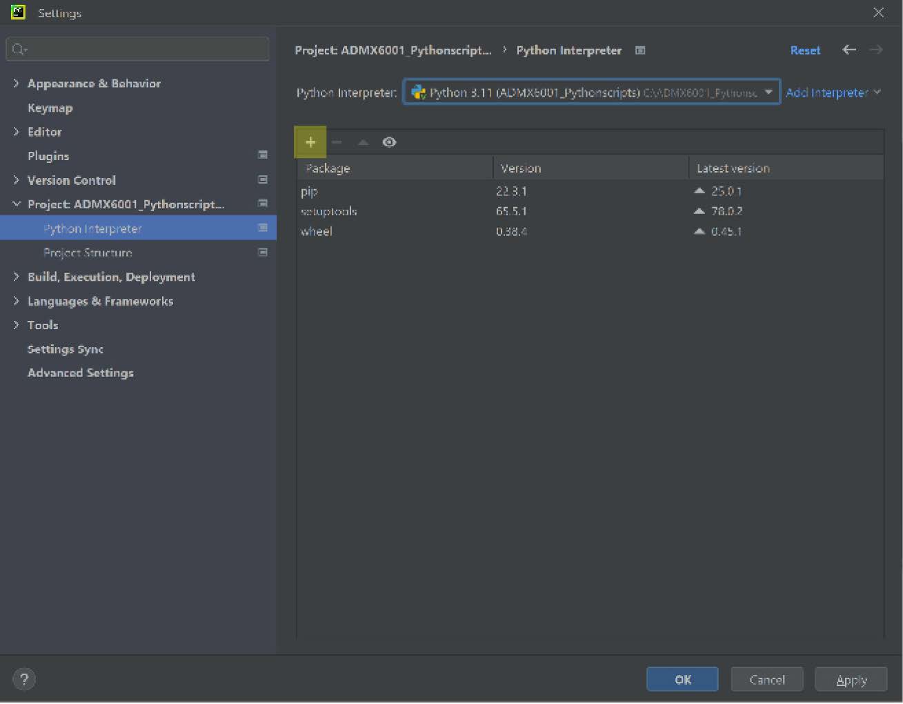 Utilizing Python scripts offers advantages for configuring and controlling the ADMX6001-EBZ board and enables data visualization and processing. Python scripts are more efficient than the manual register read and write with IIO Oscilloscope. The Python virtual environment (venv) for running ADMX6001-EBZ Python scripts can be set with or without an IDE such as PyCharm. It is required that the user installs Python 3.11.5 or a newer version and downloads the PyADI-IIO library before proceeding to the venv setting in the following section.