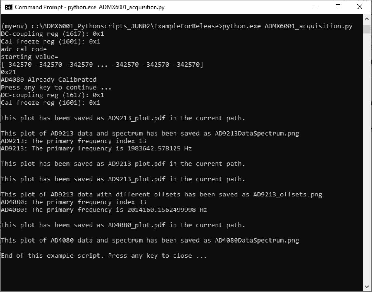 The example script ADMX6001_MultiClass_pCal.py defines the classes to setup, initiate, configure, and operate the ADMX6001-EBZ for data acquisition and visualization. A list of useful methods defined in this script for operating the setup of the ADMX6001-EBZ board and the Xilinx VCU118 board follows.