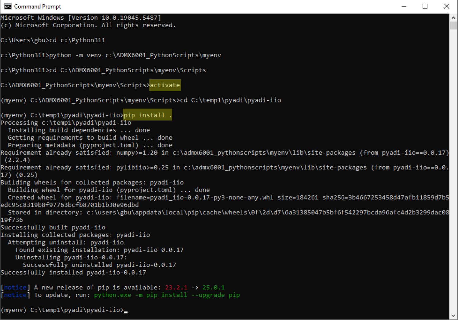 In the (myenv) command window, install the PyADI-IIO library. Go to the PyADI-IIO library folder (C:\temp1\pyadi\pyadi-iio in the example) and install pyadi-iio library: pip install.