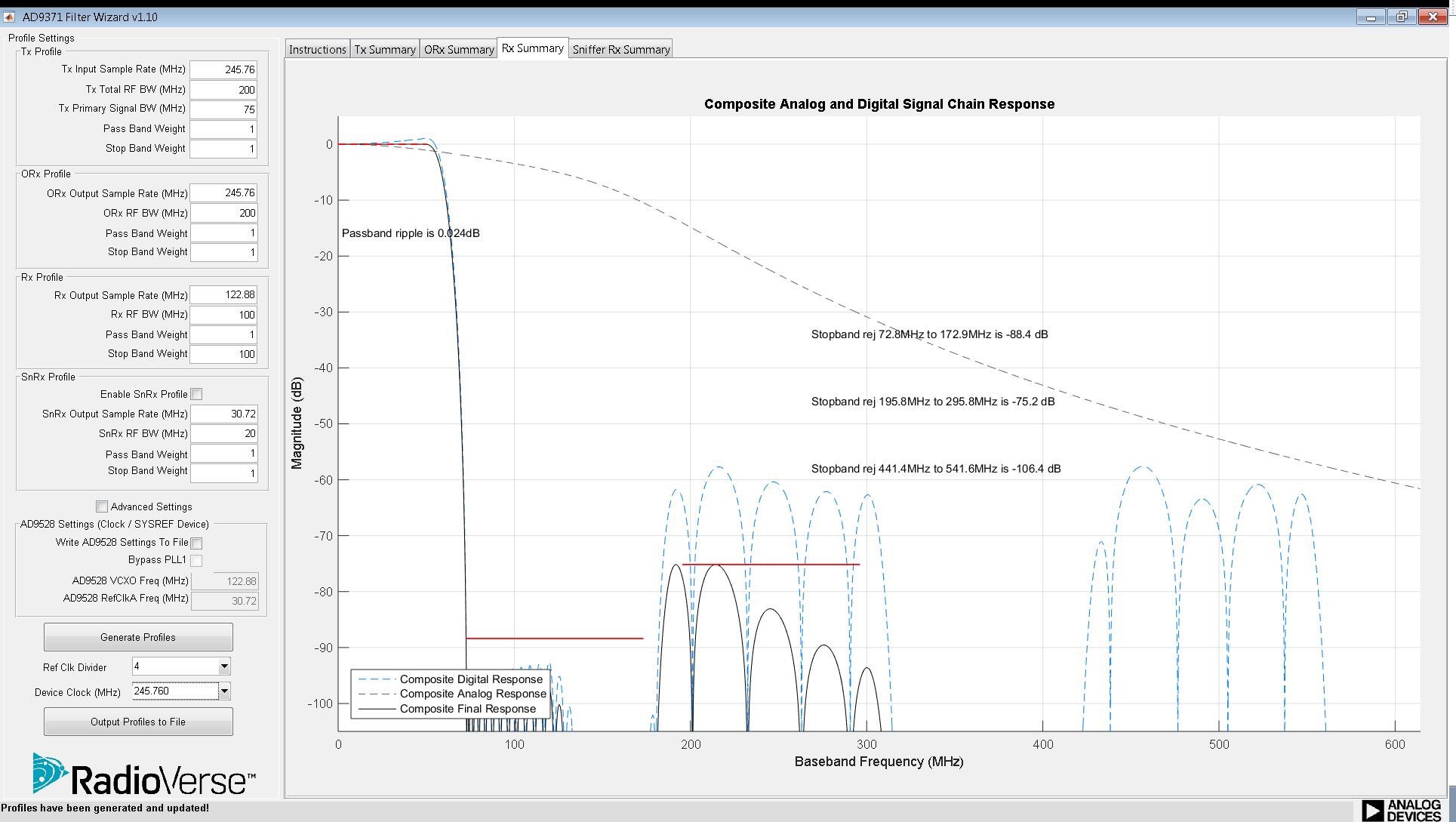 The defaults populated at startup will generate valid FIR filters if the user merely presses the “Generate Profiles” button. The window to the right will show the resulting composite response for the entire signal path as well as responses for the various blocks within the chip.
