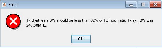 If the Tx Total (or Synthesis) bandwidth is larger than 82% of the Tx sample rate, then the Wizard will indicate this with red text at the bottom of the Wizard as well as a pop up window as shown below: