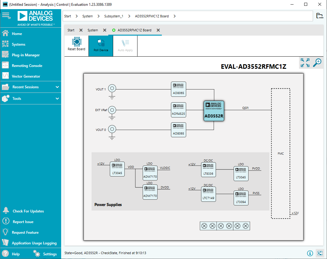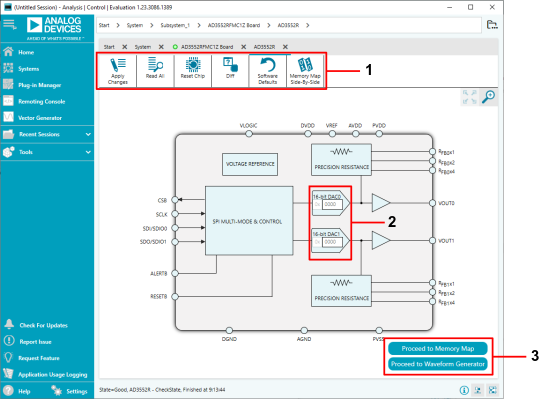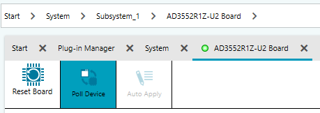 Board View - simplified diagram of the evaluation board. Use Poll Device to verify connectivity and Reset Board to power cycle the evaluation board. Double-click the AD3552R block to open the Chip View.