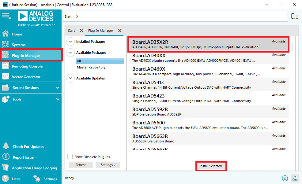 Board.AD35X2R, and click Install Selected. The plugin moves to Installed Packages.