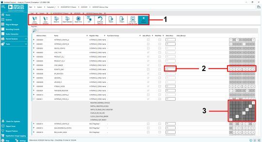 Memory Map View - complete register map displayed as a list of registers or bit fields. Supports sorting, searching, individual or bulk read/write, CSV export and import.