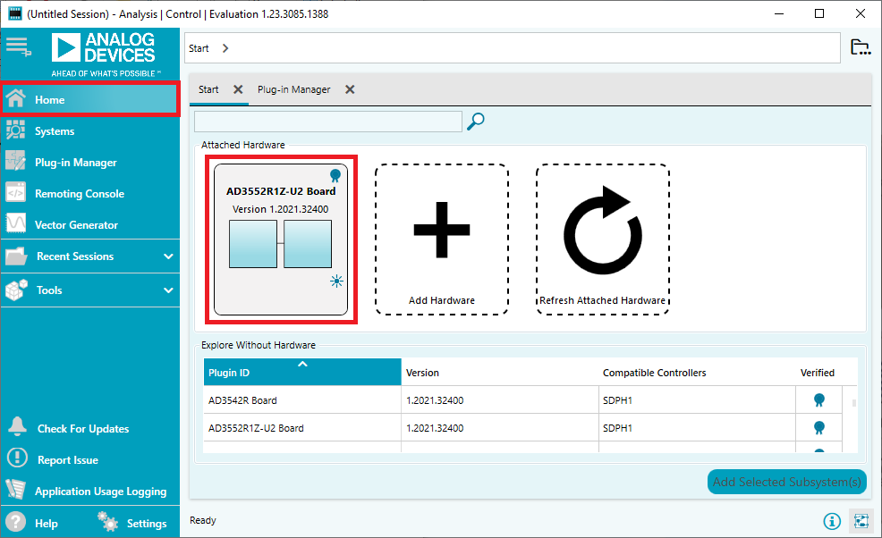 Click Home on the left-hand menu. If the board is connected it appears in Attached Hardware. If you don’t have the board yet, you can still explore the plugin by double-clicking the desired board in the Explore Without Hardware list.