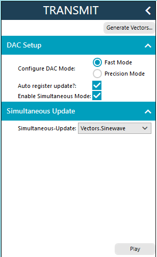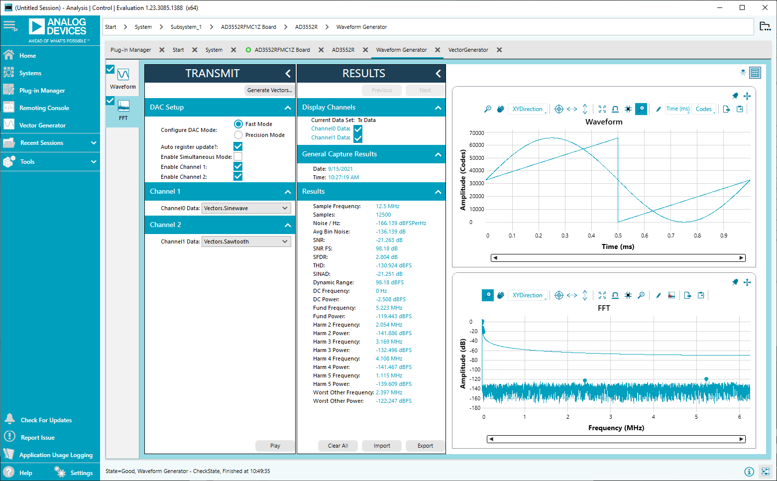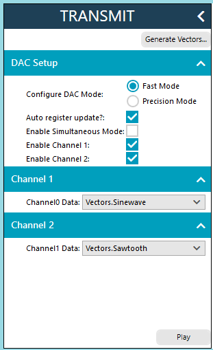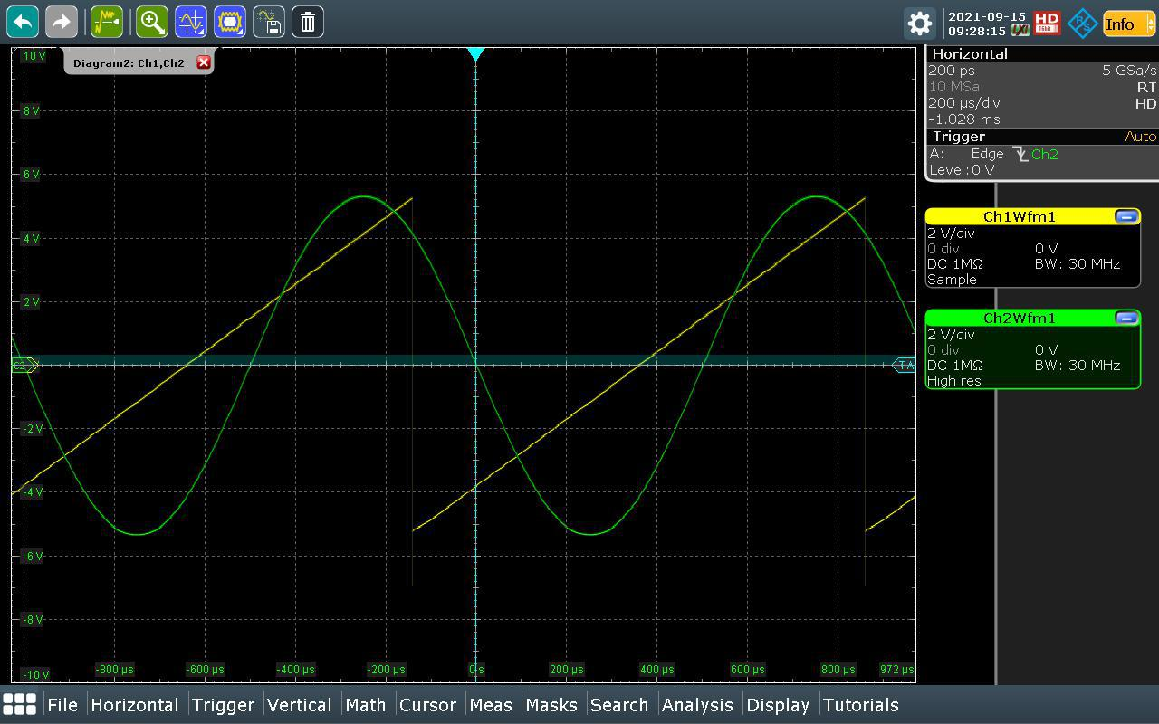 CH0_CH1_OUTPUT_RANGE(e.g.,0x33for ±10 V). Click Apply All.Open the Vector Generator and create a 1 kHz sine wave and a 1 kHz sawtooth wave.