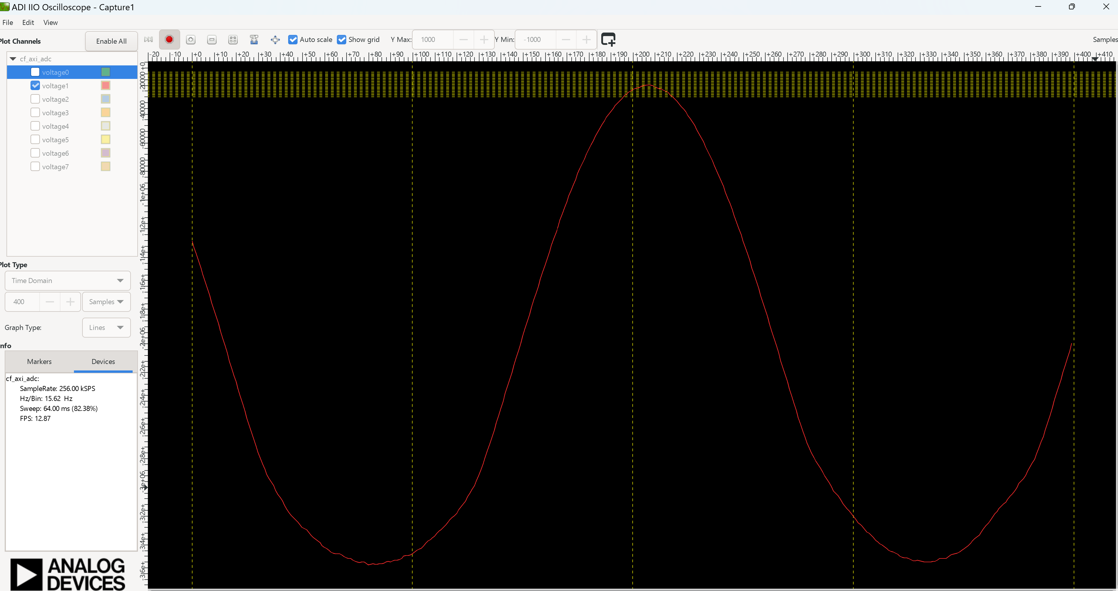 Refreshto display the available IIO devices and pressConnect.After the board is connected and a channel is enabled, hit the play button. The data capture window will display the sampled data.