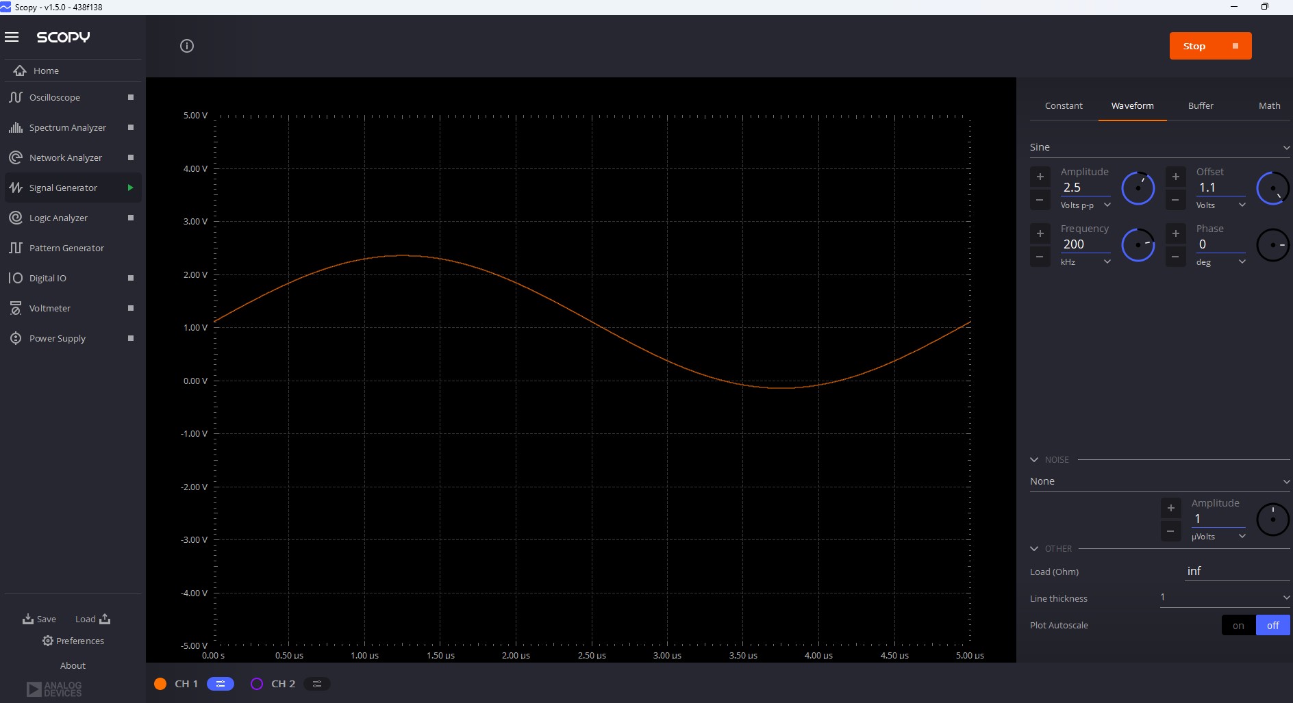 After the board is connected and a channel is enabled, hit the play button. Then the data capture window can be seen like in the shown picture.