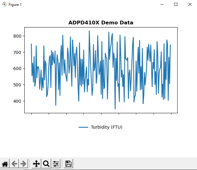 A plot will appear showing the measured and computed turbidity in FTU. You have the option to save a copy of the displayed waveform at any point in time using the matplotlib controls at the top. Remove the cuvette and replace the sample with a different turbidity to observe the measurement change.