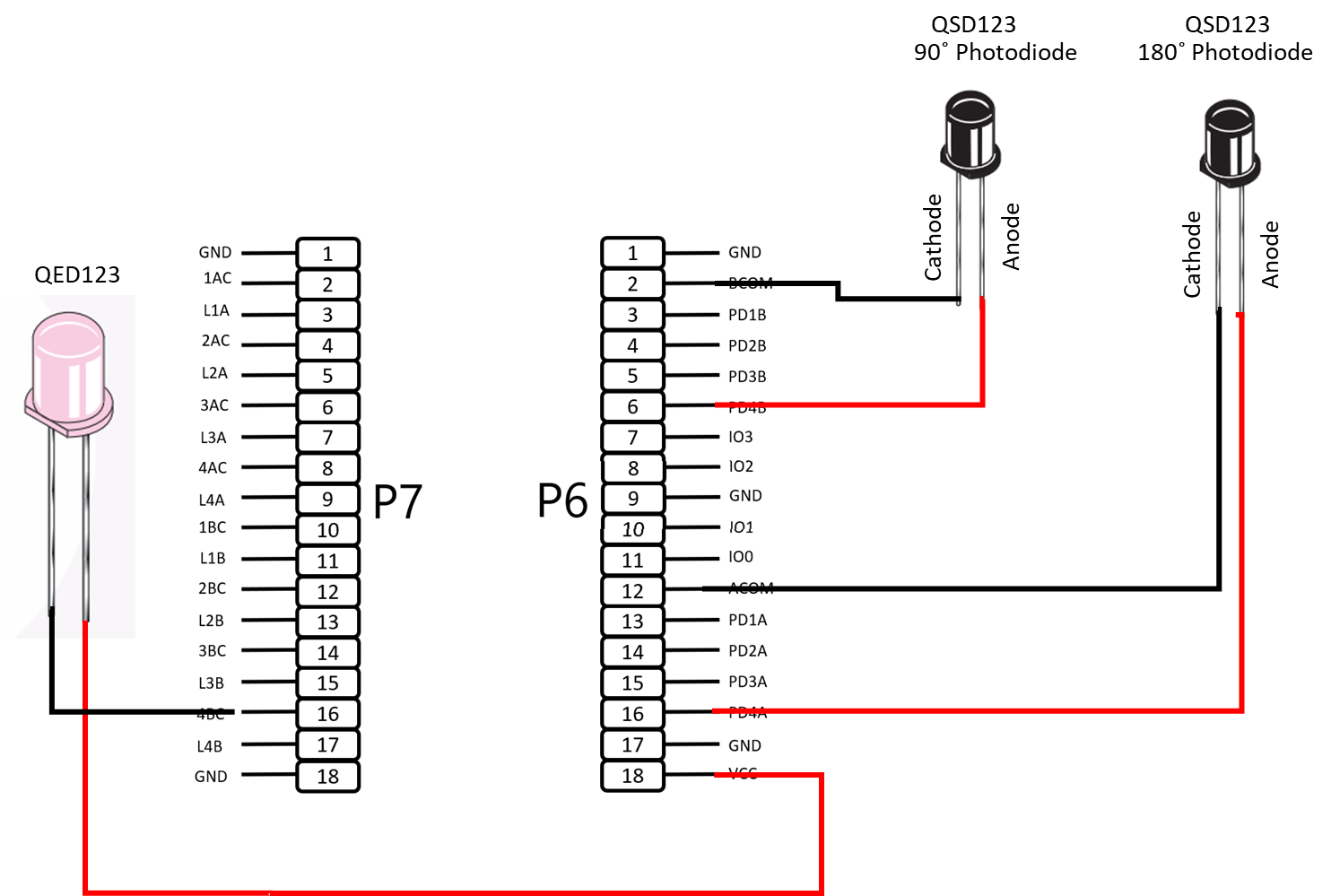 To set up the optical path, use the prototype board that comes in the box with the EVAL-ADPD410x-ARDZ as a base. The connection diagram for the QED123 LED and the two QSD123 is shown below: