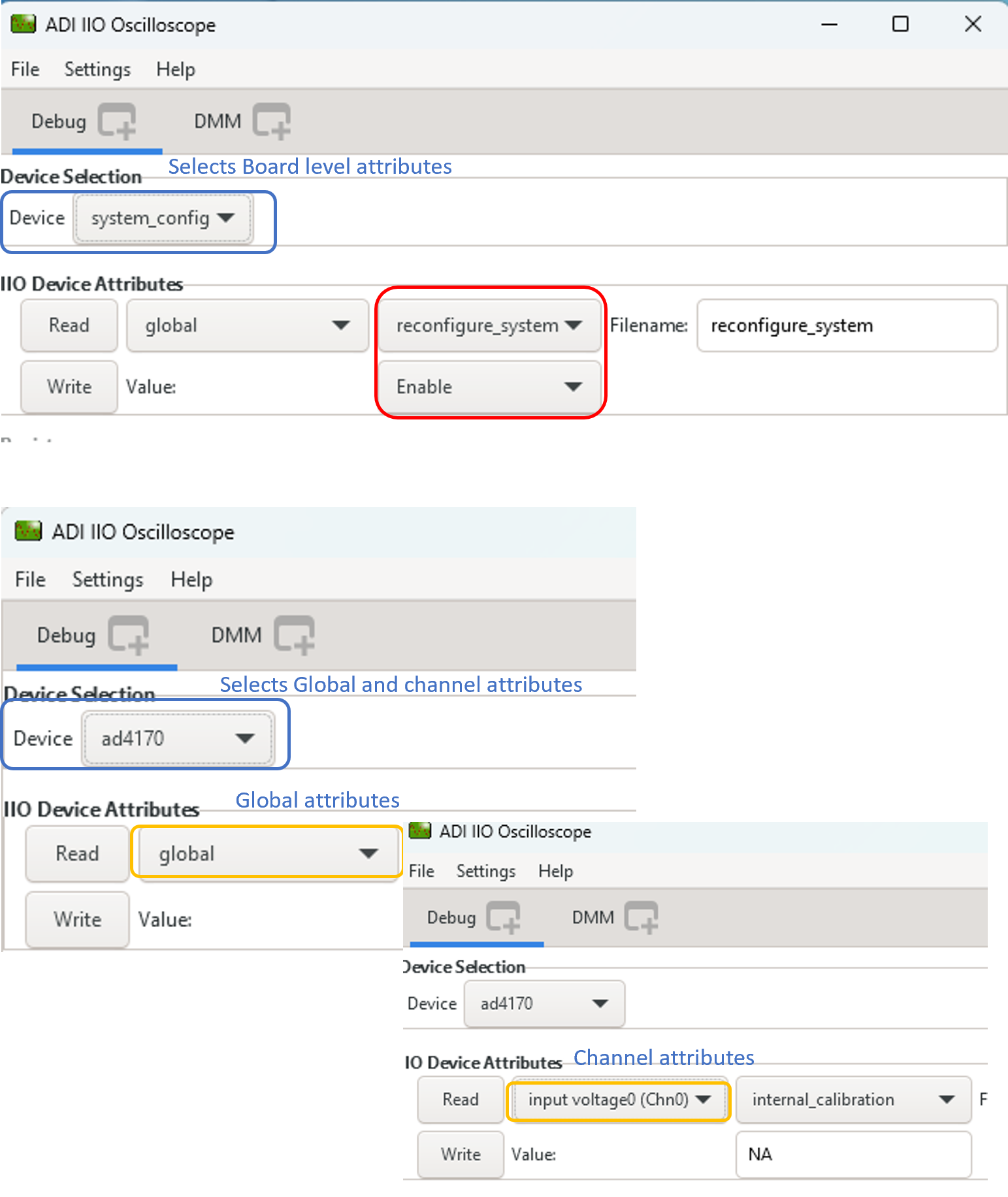 The IIO Oscilloscope allows user to access and configure different device parameters, called as ‘Attributes“. There are 3 types of attributes: