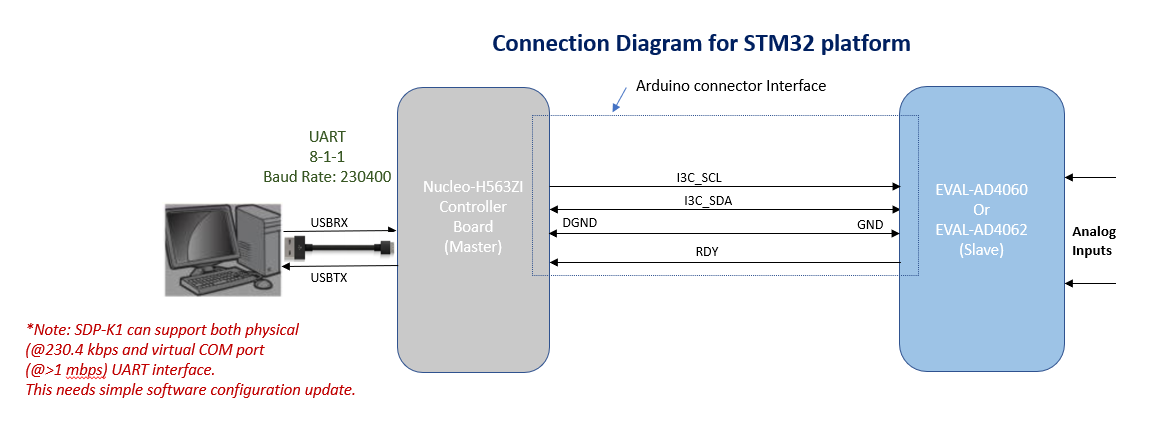 Required: SDP-K1 (or an STM32 board ), EVAL-AD4052 or EVAL-AD4050 board and USB cable.