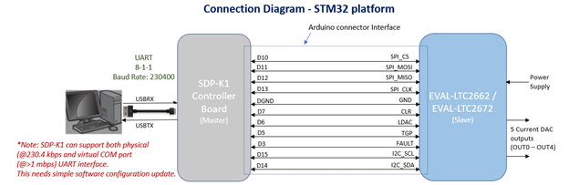 Connect the EVAL-LTC2662/EVAL-LTC2672 board to SDP-K1 board (or an equivalent STM32 board). Connect controller board to the PC using the USB cable.